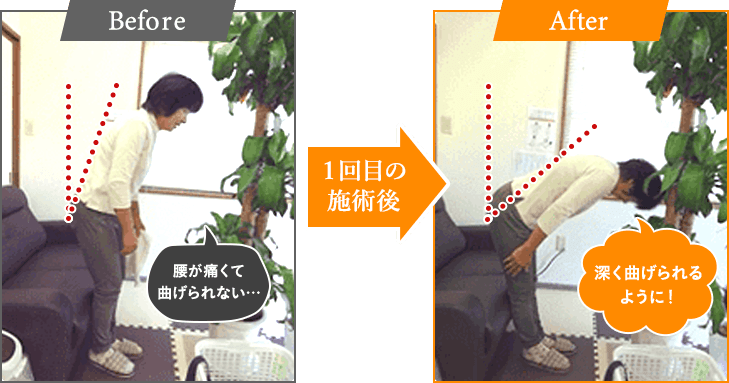 15年前から腰が痛く座って中腰から立つ時に、曲がったような腰になって、真っすぐ伸びないような症状でした。 仕事で重い物を下から上げる時など、きつかったです。